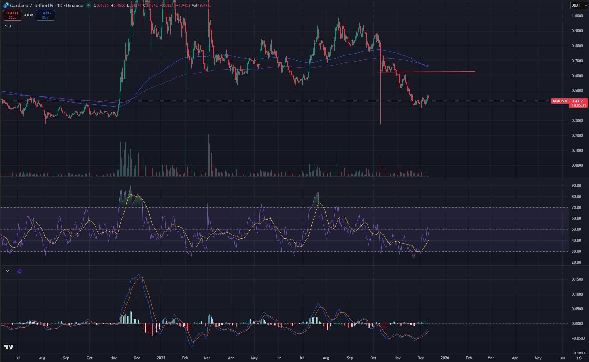 The daily timeframe, however, paints a noticeably stronger picture. RSI is recovering above its average, indicating renewed momentum, while MACD is turning positive for the first time since the October 10 flash crash. These are early signs that ADA could build a more sustained uptrend if macro conditions cooperate.
