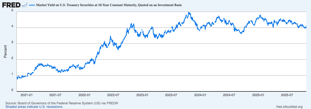 The 10-year Treasury yield ended last week near 4.1%, based on the Fed’s constant-maturity data.