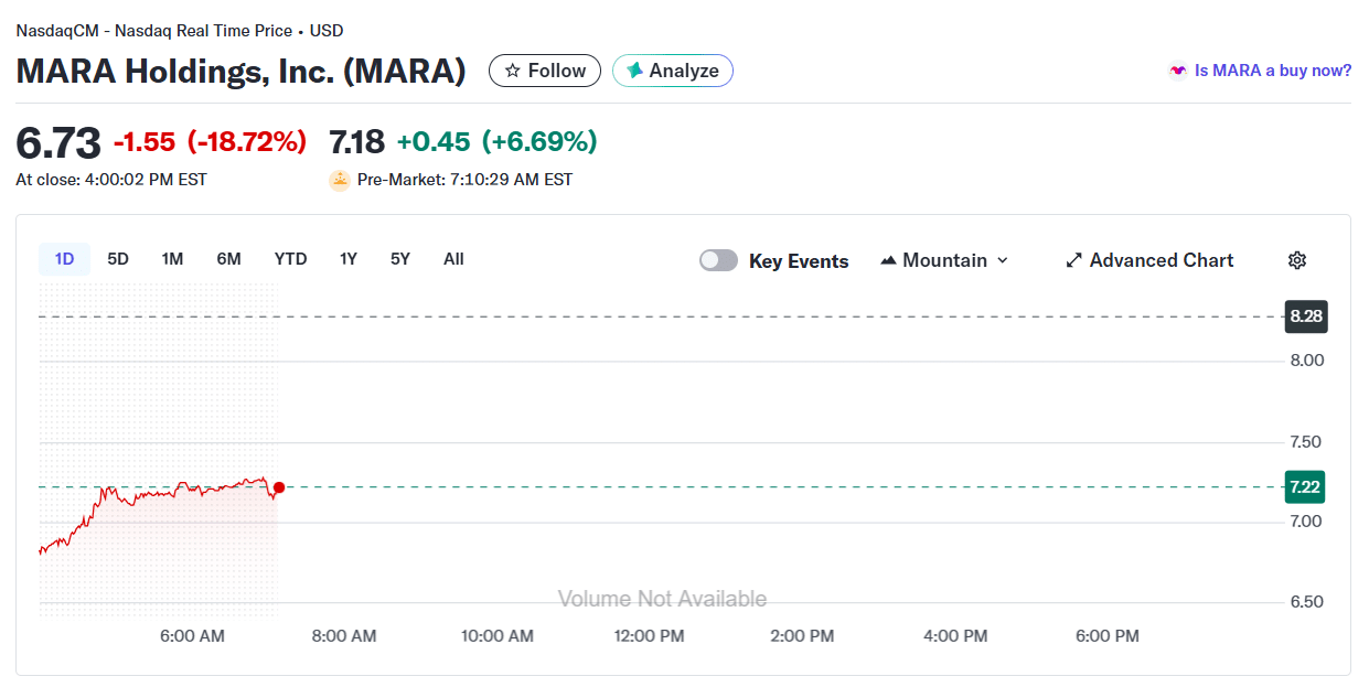MARA shares fell nearly 19% on Thursday, pushing year-to-date losses to 25% amid mounting crypto market pressure, per Yahoo Finance. The stock edged higher in premarket trading Friday, recovering some of the previous day’s losses.