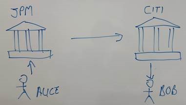 | Alice who banks at JP Morgan, sends USD to Bob who banks at Citi | AliceUSDJPM → BobUSDCiti |