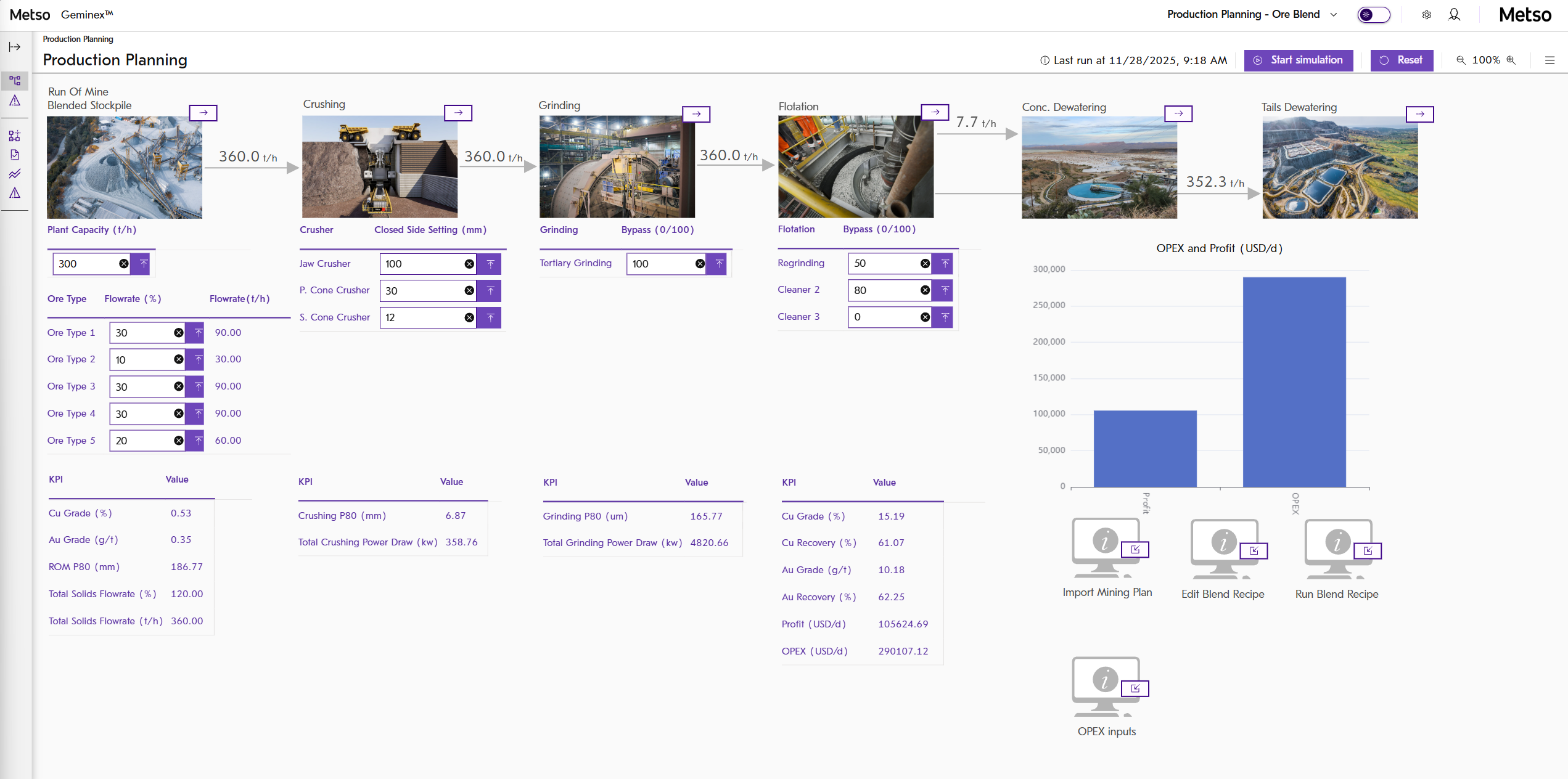 You can simplify Geminex portfolio to three main areas, Matinlauri says. First operator training simulators – whenever a customer starts up a new plant, Metso actually has the flowsheet and simulations that it can make available through the operations user interface, the DCS automation system. “Secondly, with Geminex we can do long term, and mid term simulation – monthly, quarterly, yearly simulations that allow you to adjust your ore body parameters based on the mine plan, sampling data and the block model – so you can input expected grade, hardness, abrasiveness, clay content – a long list of data on what you’re going to be getting into your concentrator over a period of time and then adjust the operating parameters – how you’re going to run the plant. In some cases over the long term you might use it to redesign your process, such as adjusting your fine grinding and flotation.”