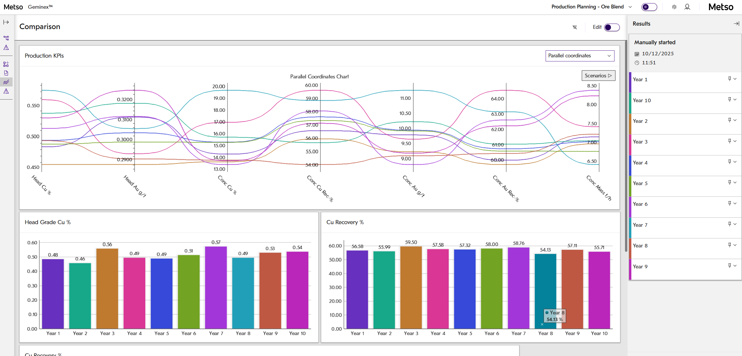 Once you’ve run the simulations, you’re able to actually see the results. For example, what is your final copper concentrate percent going to be. “You can compare all the different scenarios and process stages over time and make decisions on what are you wanting to optimise. And therefore, instead of let’s see what happens, you’re really able to plan it. Once you’ve defined the scenarios and decided which way do you want to operate, you’re able to easily see moving forward how the process is going to change and what the end result is going to be. We store all the data of the run simulations and compare them with actual results. And the validation levels are very high – the simulations are very accurate.”