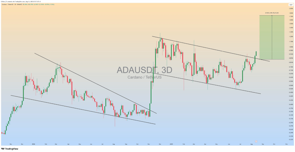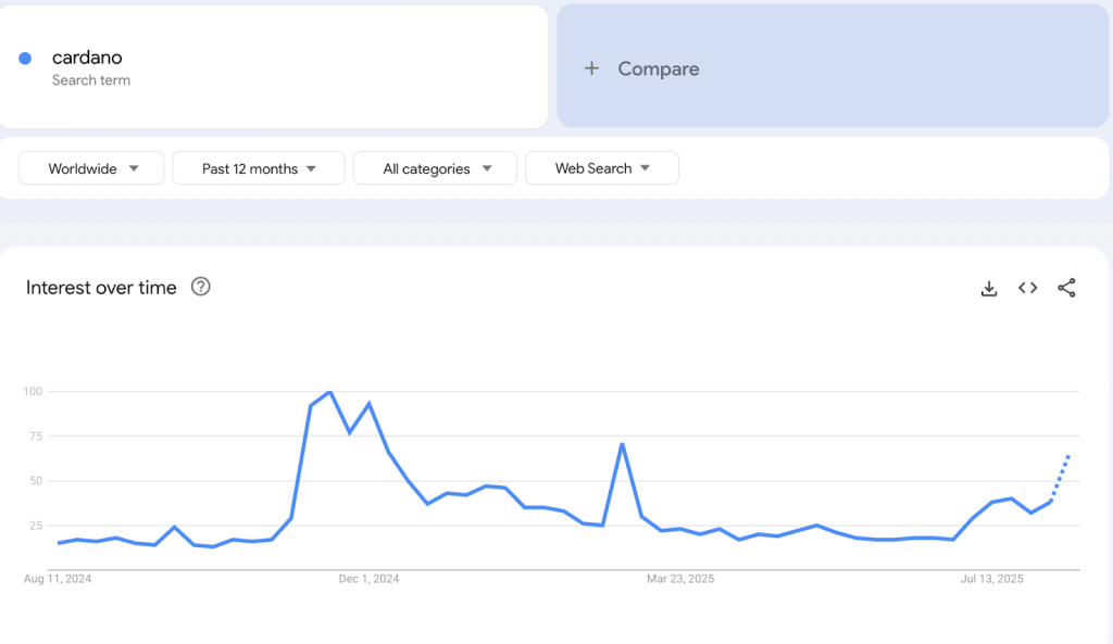 Chart watchers have flagged a multi-month bull flag breakout pattern on Cardano’s three-day chart. If the move holds, projections by Clifton Fx suggest the token could gain as much as 150% in the coming weeks, potentially targeting the $1.60–$1.75 range. Trader sentiment is being reinforced by on-chain data showing over 15 billion ADA — roughly 45% of total supply — has remained unmoved for more than a year, signaling long-term conviction. Retail interest is also on the rise, with Google Trends data showing “Cardano” searches at a five-month high.