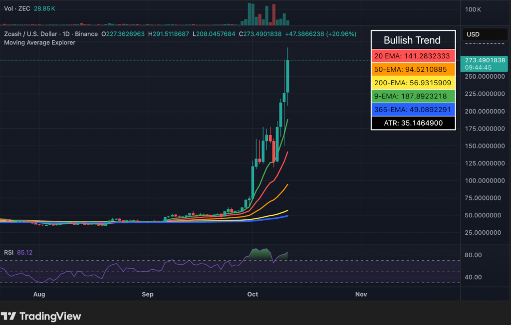 Zcash has emerged as one of the strongest performers in recent weeks, rallying nearly 50% in the last 7 days and recovering fully from Friday’s historic crash. After plunging 45% to $150 during the liquidation cascade triggered by Trump’s China tariff announcement, ZEC quickly rebounded to a high of $291 before settling around $247. The privacy-focused coin is now trading near pre-crash levels, outpacing nearly all major altcoins in both recovery and momentum.
