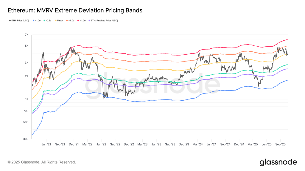 Meanwhile, Ethereum’s technical structure remains bullish despite recent volatility. ETH rebounded sharply from its two-month low near $3,435, forming what analysts identify as a bull-flag continuation pattern. The 200-day exponential moving average near $3,550 has acted as reliable support, while momentum indicators suggest potential upside toward $4,500–$5,000 in October if the pattern confirms. On-chain MVRV deviation data from Glassnode further reinforces the setup, showing ETH consolidating around its mean band near $3,900—a level that historically precedes major rallies within bull cycles.