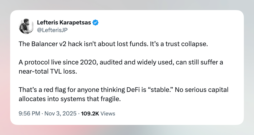 Balancer, one of the longest-standing DeFi projects, has been exploited for roughly $120 million, once again highlighting that safety is just an illusion in DeFi land. For Balancer, it’s the third attack this year, following a stablecoin exploit in August caused by a vulnerability in its liquidity pool contracts and a front-end attack that cost users $238,000 in September.Â