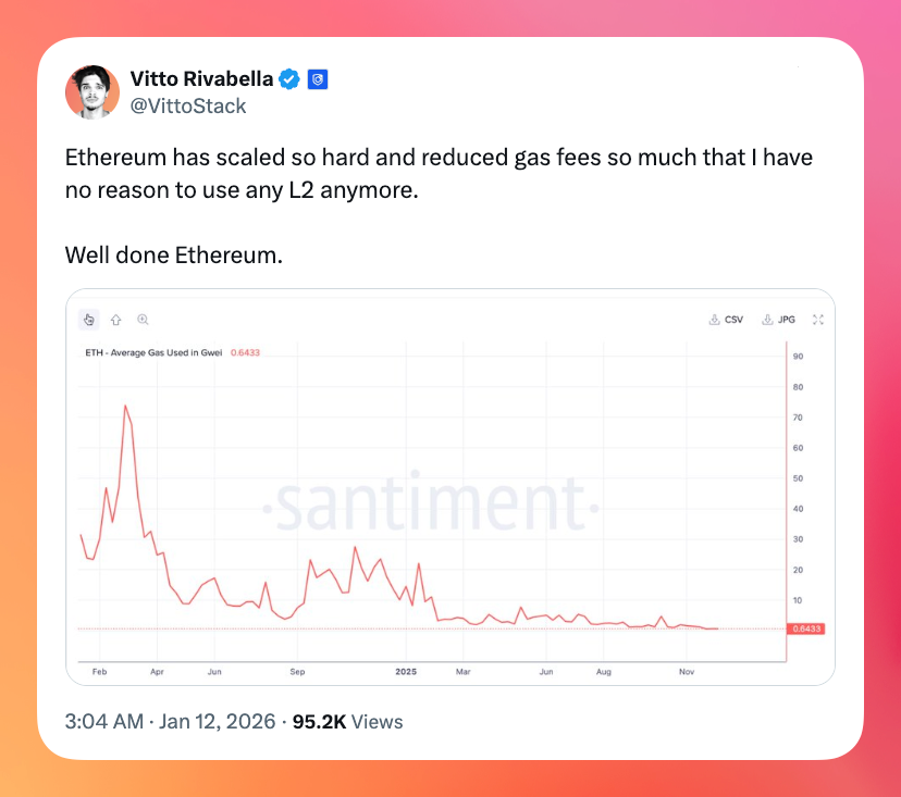 Some view this as an admission that the entire L2 thing didn’t work out as planned. It doesn’t help their cause that mainnet Ethereum fees have been very cheap recently.