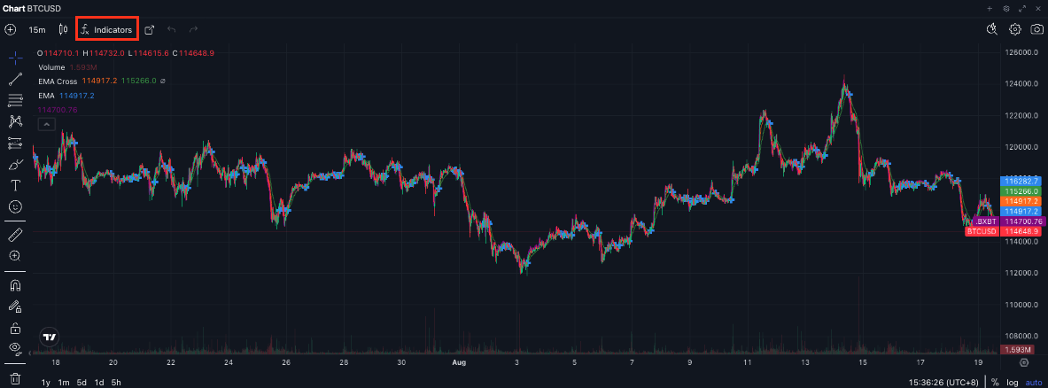 2. Locate the “Indicators” button. You will find it at the top of your chart, next to the timeframes and other chart tools.