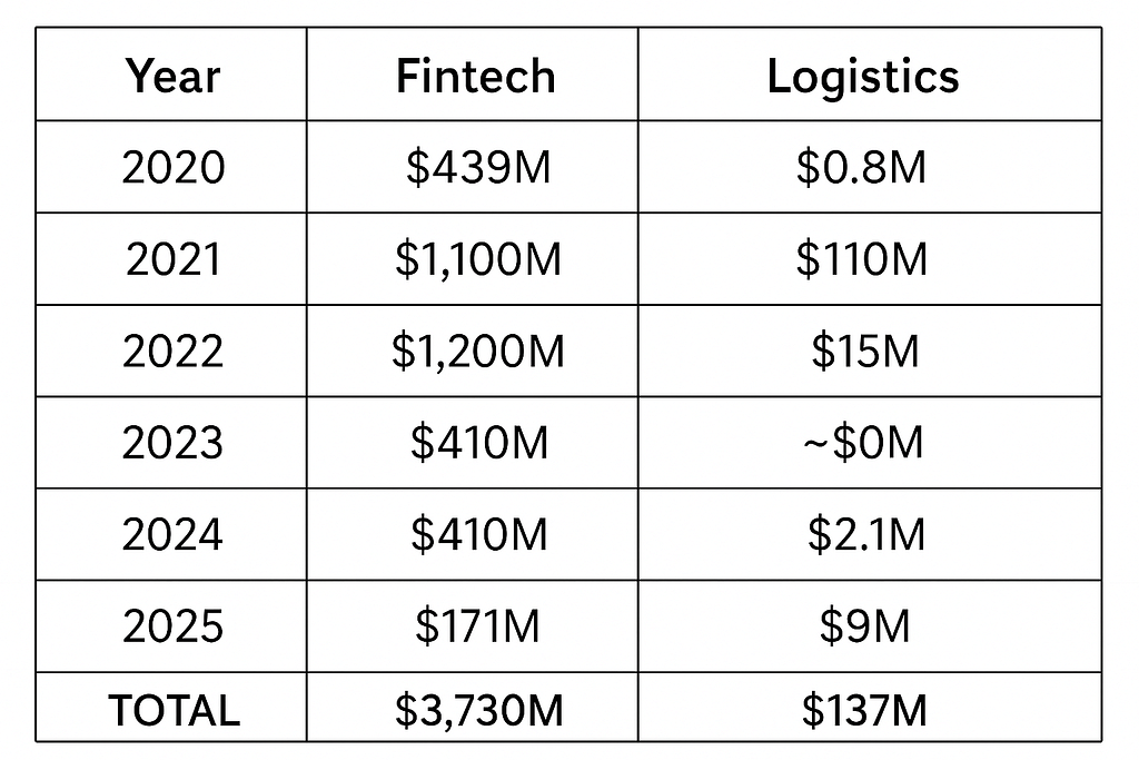 But when you zoom out to five years, the story gets more interesting: Fintech: $3.73 billion, Logistics: $137 million A 27x difference.